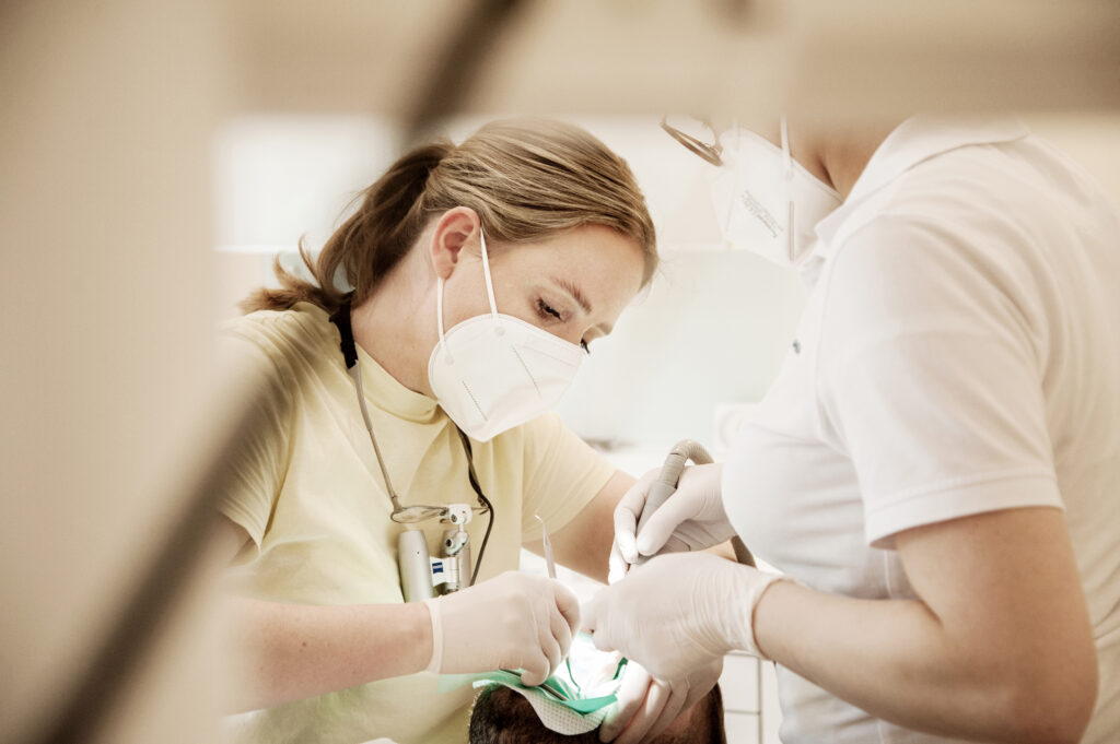 Parodontitis bedeutet Entzündungen von Zahnzwischenräumen und weiteren Teilen des Zahnhalteapparats. Als Erkrankung des Zahnbetts gilt Parodontitis als wesentlicher Auslöser von Zahnverlust. Früherkennung und nachhaltiges Behandeln beugen diesem Verlust allerdings stark vor. Unsere Parodontitistherapie fußt dazu auf wissenschaftlichen Konzepten.